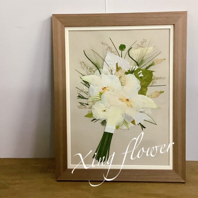 花嫁様が結婚式で使った生花の花やプロポーズの花束を、特殊なドライフラワーの加工や押し花加工で半永久的に保存します。保存方法は押し花や立体的なガラスや3D(立体)額など、40以上の種類から理想の形で制作が可能で、種類の豊富さが特徴です。