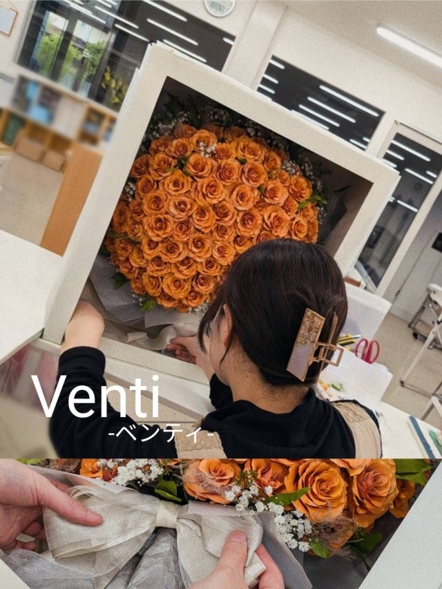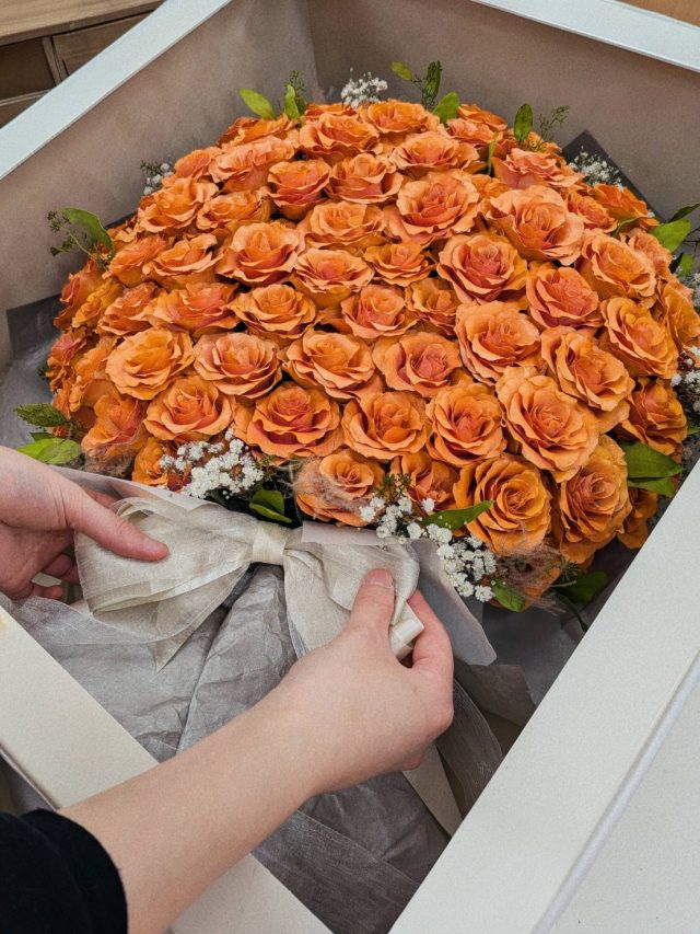 108本のオレンジバラをカスミソウとグリーンと一緒に保存させていただきました🍊