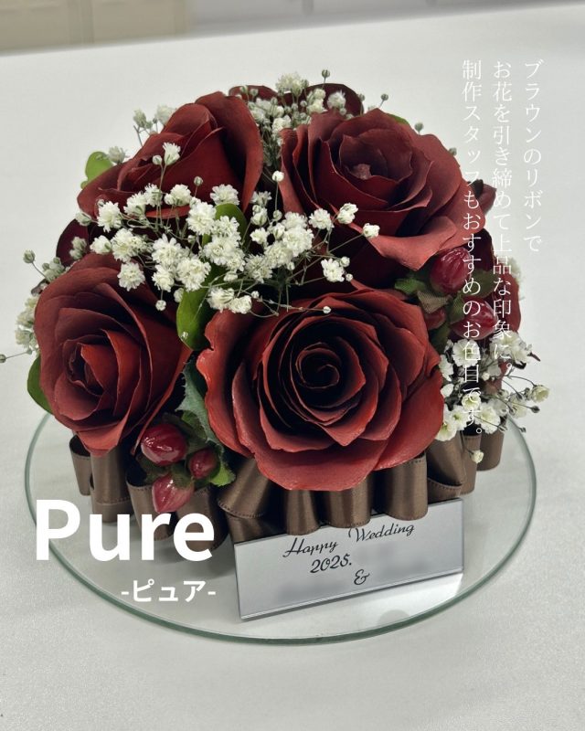 花嫁様が結婚式で使った生花の花やプロポーズの花束を、特殊なドライフラワーの加工や押し花加工で半永久的に保存します。保存方法は押し花や立体的なガラスや3D(立体)額など、40以上の種類から理想の形で制作が可能で、種類の豊富さが特徴です。