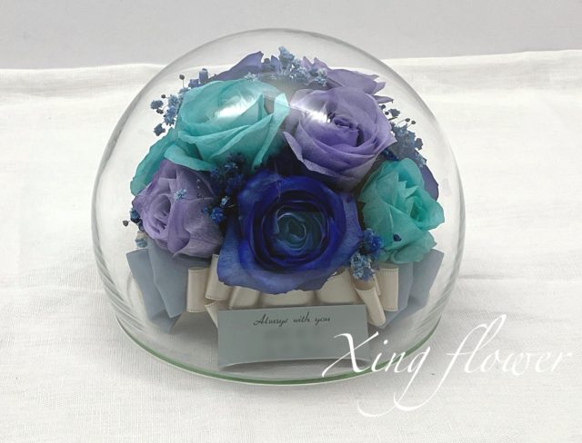 青・水色・紫色の鮮やかな花束を、360度楽しめる「ピュア」商品で保存させていただきました!