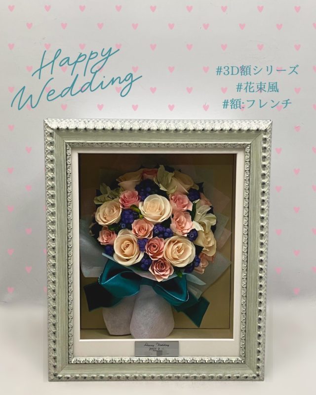花嫁様が結婚式で使った生花の花やプロポーズの花束を、特殊なドライフラワーの加工や押し花加工で半永久的に保存します。保存方法は押し花や立体的なガラスや3D(立体)額など、40以上の種類から理想の形で制作が可能で、種類の豊富さが特徴です。