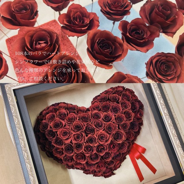 最近はプロポーズの108本のバラの花束を残す特注額での制作依頼も増えております。