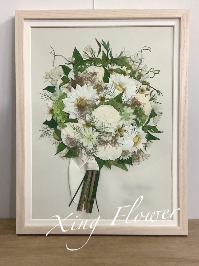 花嫁様が結婚式で使った生花の花やプロポーズの花束を、特殊なドライフラワーの加工や押し花加工で半永久的に保存します。保存方法は押し花や立体的なガラスや3D(立体)額など、40以上の種類から理想の形で制作が可能で、種類の豊富さが特徴です。