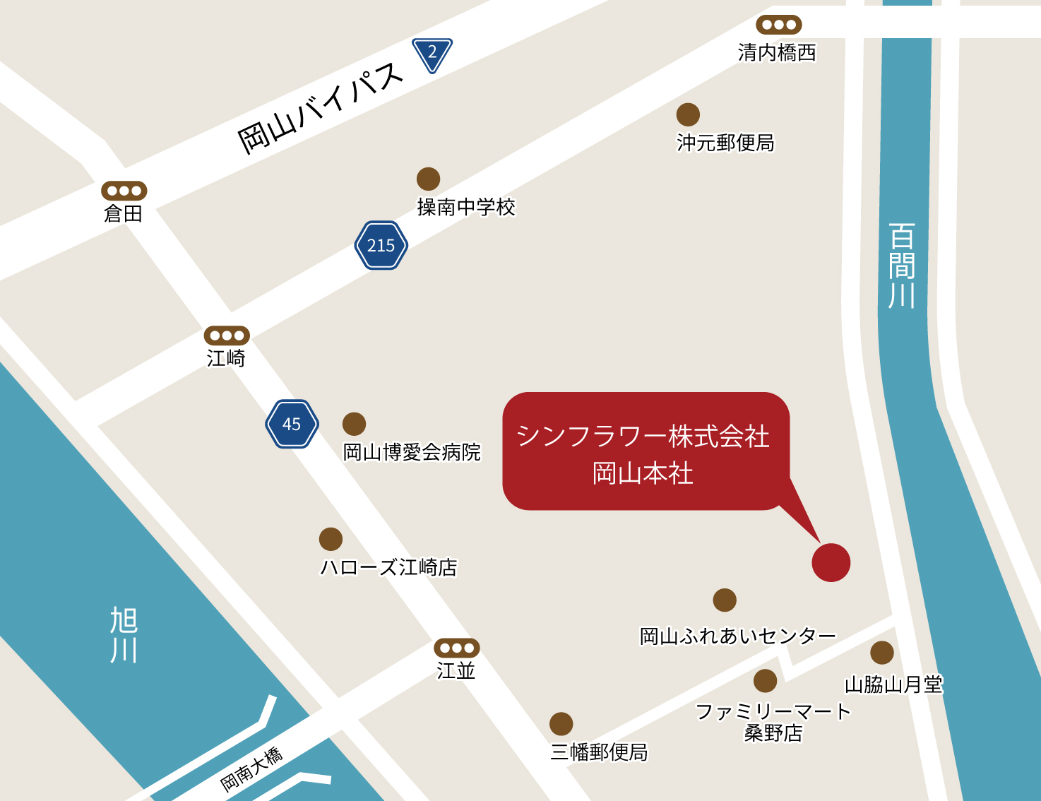 岡山本社工房…岡山ふれあいセンターバス停徒歩5分(※駐車場あり)