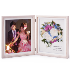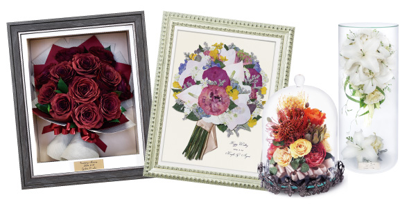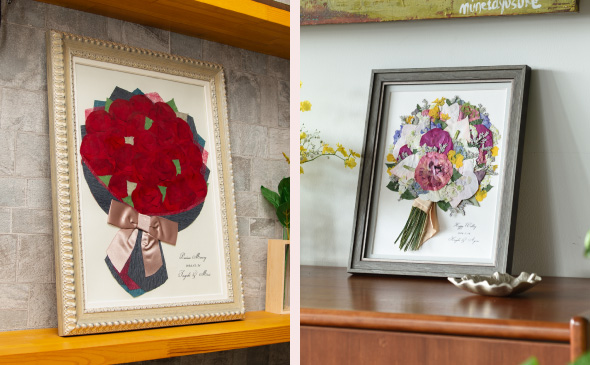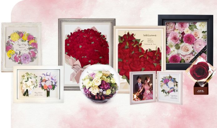 壁掛けで飾りやすい押し花アートや、立体的に保存するボトルブーケや3D額など多彩なラインナップからお選びいただけます。額は20種類以上のデザインをご用意しており、お部屋の雰囲気に合わせてセレクト可能。さらに、プレートにお名前や記念日を刻印するサービスもあり、世界に一つだけのインテリアとしてお住まいを彩ります。