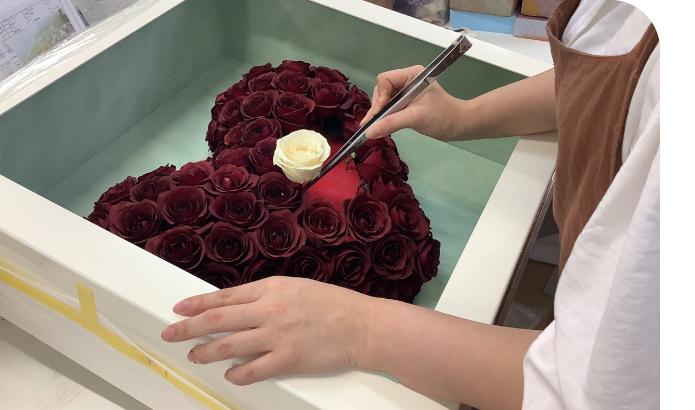 お花到着後、約1ヶ月ほど保存加工にお時間をいただいてから、いよいよ制作となります。