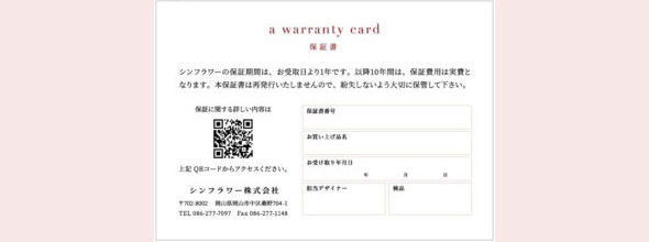 ※高温多湿・直射日光・直接照明など、取り扱い書に書かれている変色の原因となるような場所で飾られたものについては無償保証の対象とはなりません。