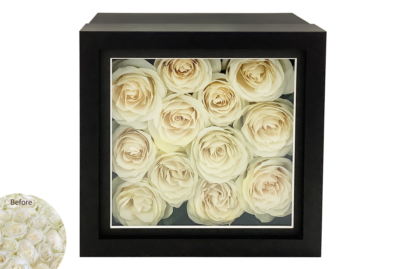 オーダーメイドの特別な額装で108本のバラを華やかに立体的に配置します。