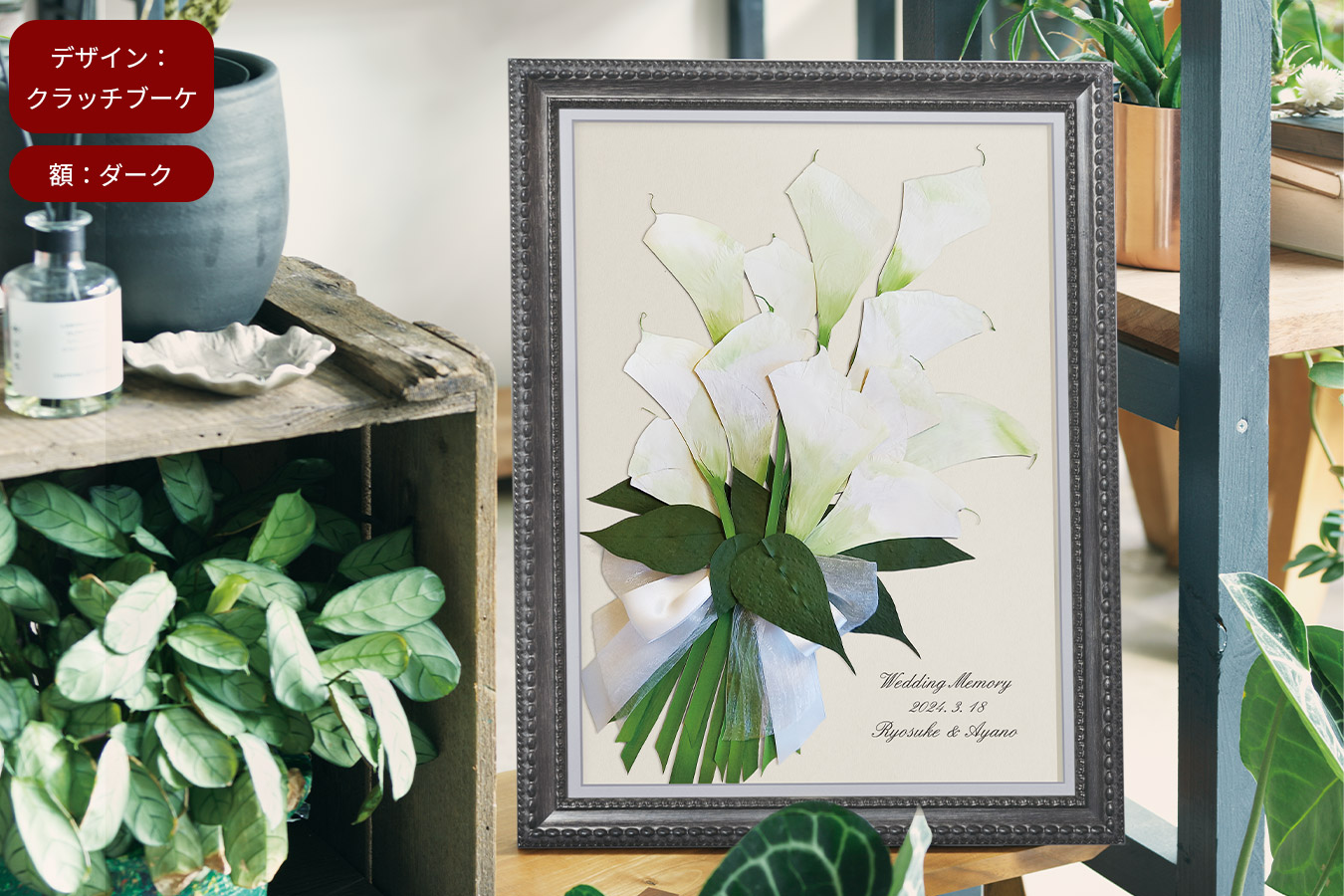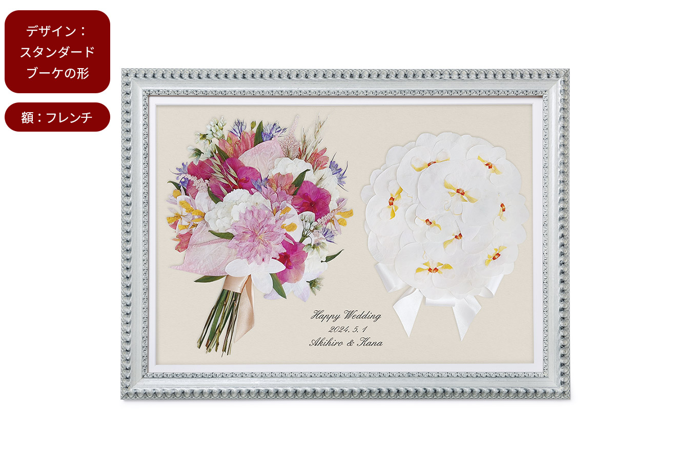 ウエディングブーケ・カクテルブーケの二つのブーケを一緒の額に収めます。