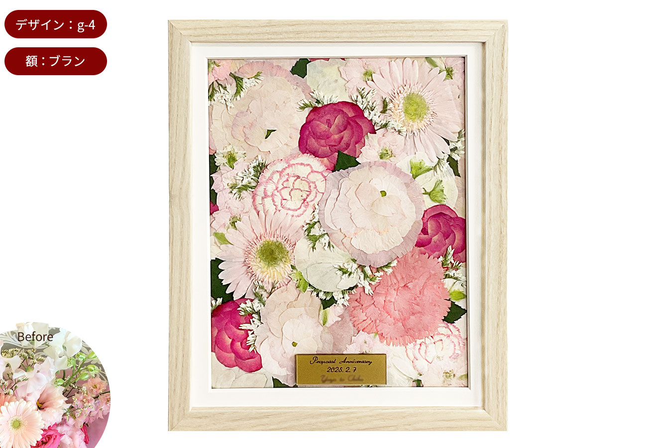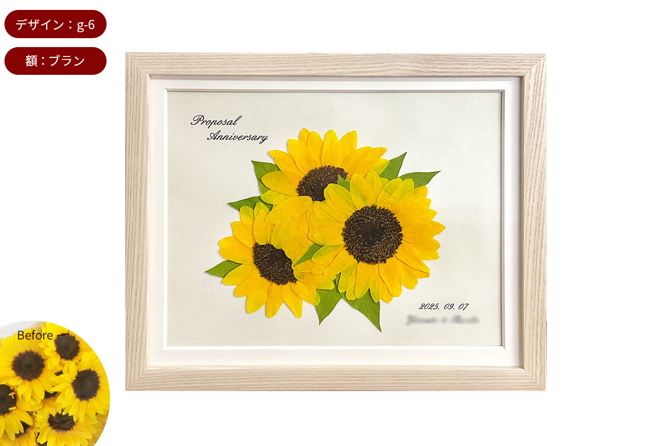 押し花のSサイズです。一番小さいサイズで、お部屋に飾りやすいサイズ感となります。額いっぱいにアレンジできる「ハート」「リース」「敷き詰め」デザインがおすすめとなります。